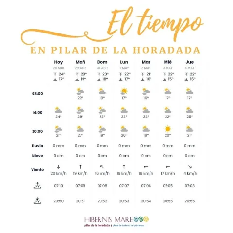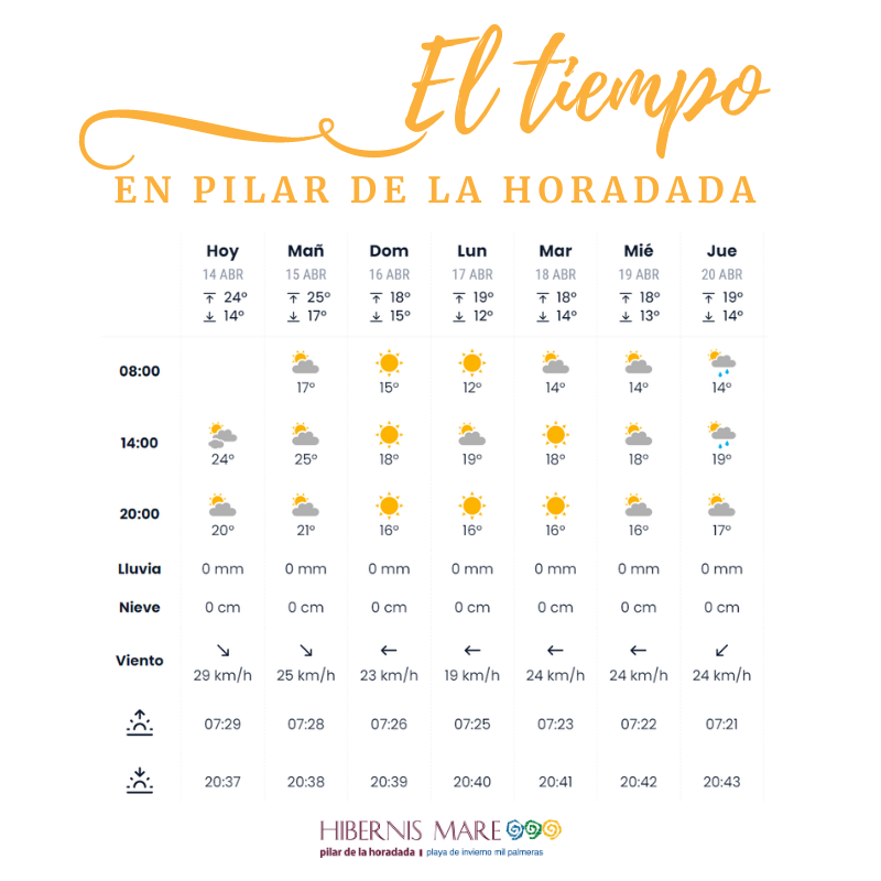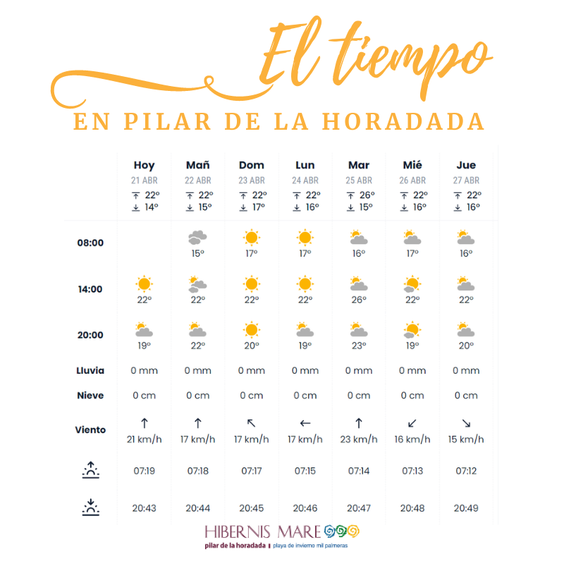 El buen tiempo nos sigue acompañando en Hibernis Mare, por lo que disfrutaremos de unas temperaturas sin grandes cambios, quizás algo de nubosidad para sábado, pero en términos generales se espera un fin de semana muy agradable para disfrutar de todas nuestras actividades lúdico-saludables en el entorno de la playa de Mil Palmeras.